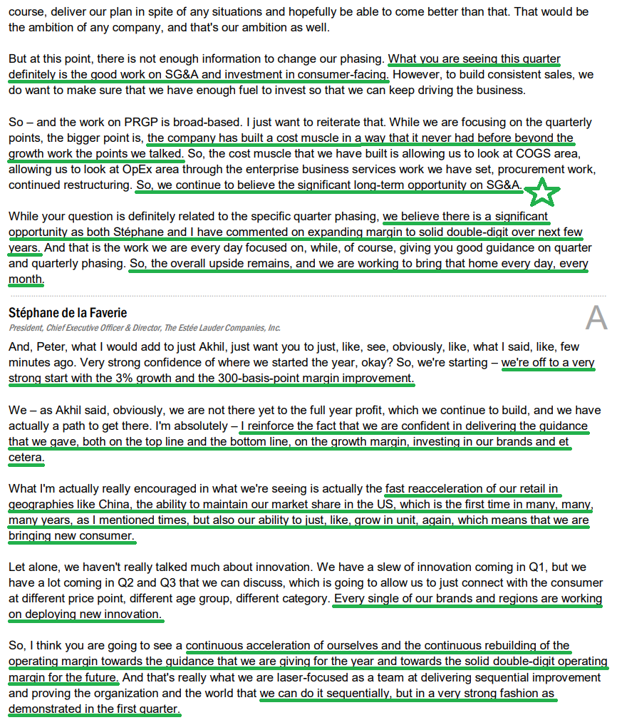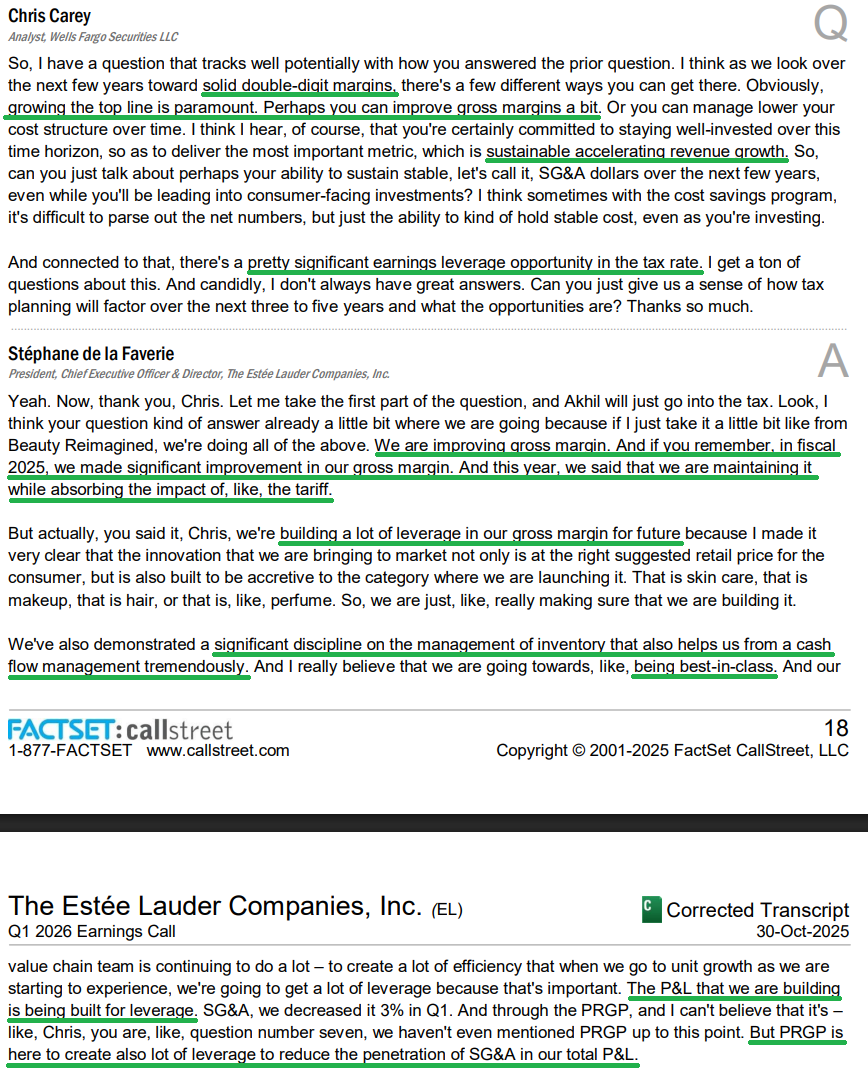 4) Profitability continued to improve, with adjusted gross margins of 73.3%, up 60 bps YoY from 72.7%. For the full year, management continues to expect gross margins to be flat to modestly positive versus 74% in FY2025, while noting meaningful upside potential remains. The most important metric in the Estée Lauder turnaround, adjusted operating margins, expanded by 300 bps in Q1 to 7.3%, ahead of expectations. Management expects operating margins to improve sequentially throughout the year, with full year guidance of 9.4–9.9% as the business works its way back toward solid double digit margins over time.