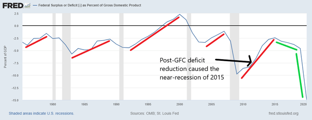 Long-term, we continue to expect the current primary bull trend to continue like the dot.com bull market did in the latter half of the 1990s...only more so! In the 1990s, the Clinton administration ran a budget surplus (first chart below)--by taxing more than it was spending--and bank credit increased to fill the resulting 'hole' (deficit) in the private sector. Bank credit is what fueled the dot-com bull, and that is what eventually killed the bull; debt levels in the private sector became unsustainable and had to be unwound (Note, in the second chart below, the debt was not completely unwound until the GFC).
