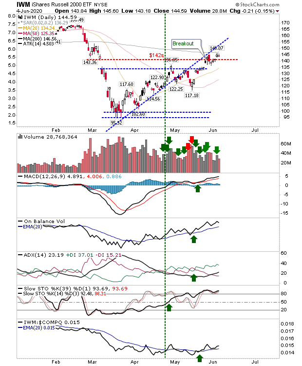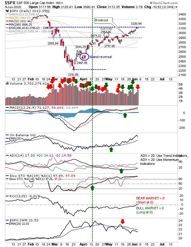 The Russell 2000 had made a strong move yesterday to clear the narrow congestion which had consolidated around the low range of last week's bearish engulfing pattern. However, it still remains pegged by 200-day MA resistance but has the benefit of good technical strength.