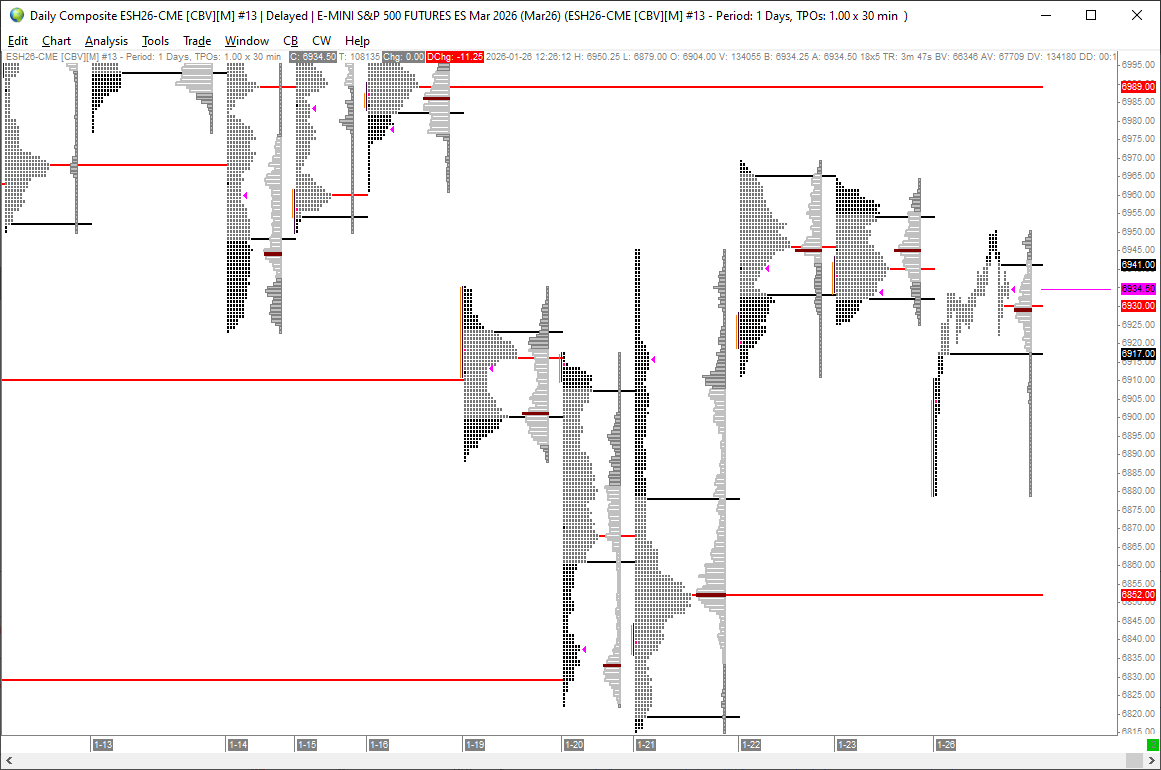 Friday closed with a balanced, inside-day profile structure on both a TPO and volume basis. From a technical perspective, this sets up a straightforward framework: either an inside-day failure or a breakout will define the directional bias for the next session. Today’s session opened with a gap down, suggesting traders should initially lean on the developing value extremes. However, with the gap already filled, attention can shift back to the distribution extremes of Friday’s profile as the primary reference levels.