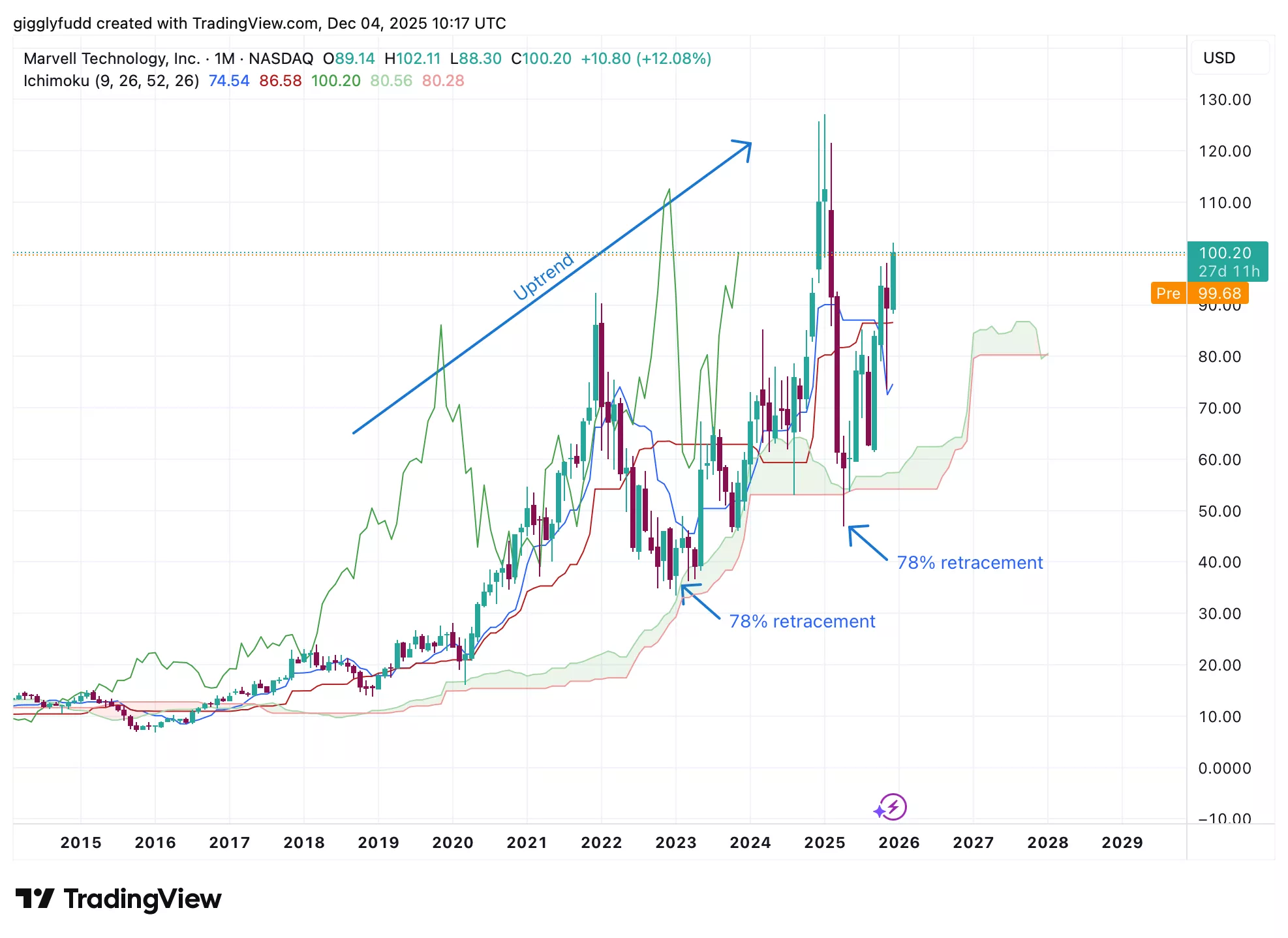 The overall pattern has been trending upward despite several deep and choppy pullbacks over the years, with some retracing as far as 78% before recovering. Even with this volatility, the stock ultimately pushed to a new high of 127.15 in January 2025, reinforcing the strength of its long-term bullish trend. Throughout most of this period, the Ichimoku cloud has stayed bullish, which generally confirms that buyers remain in control over the long run and that the broader direction continues to point upward.