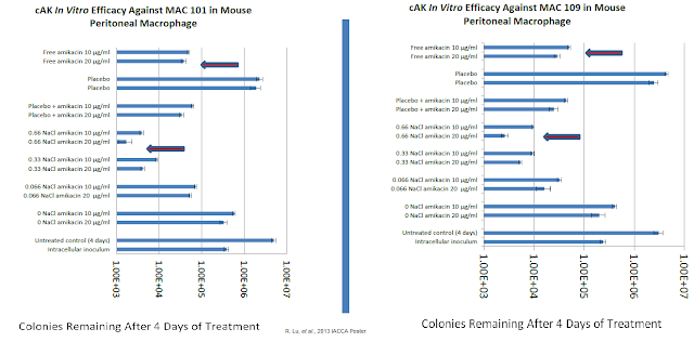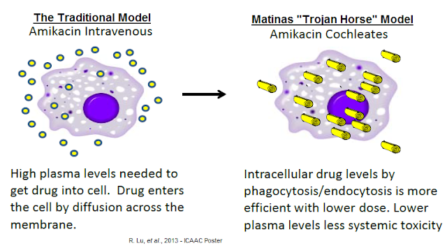 MAT2501 is a lipic-crystal nanoparticle formulation of amikacin that is currently in Phase 1 clinical studies. The in vitro activity of cochleated amikacin (cAK) was presented at the 2013 American Society for Microbiology's Interscience Conference of Antimicrobial Agents and Chemotherapy (ICAAC) scientific session. Work by company R. Lu, et al evaluated the efficacy of cAK using mouse peritoneal macrophage infected with two Mycobacterium avium complex (MAC) strains. The analysis included a positive control (free amikacin) and negative control (empty cochleate). Data show a greater than 10-fold enhanced efficacy for the optimized dose of cAK compared to free amikacin.