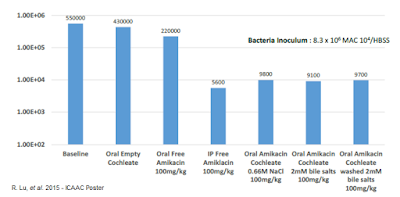 To evaluate the activity of the cAK in vivo, C57 BL/6 mice were infected with M. avium 104 by tail vein injection (disseminated NTM model). The mice were then treated with various amikacin preparations (IV free amikacin vs. oral cAK) for two weeks, after which time the mice were harvested and the bacterial load in the spleens was quantified. The results indicate that cAK was just as effective as free amikacin and far superior to orally administered amikacin or an "empty" cochleate control.