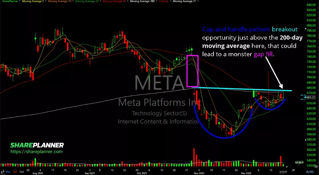 This cup and handle pattern, nearing a break out in Meta Platforms, is getting interesting.