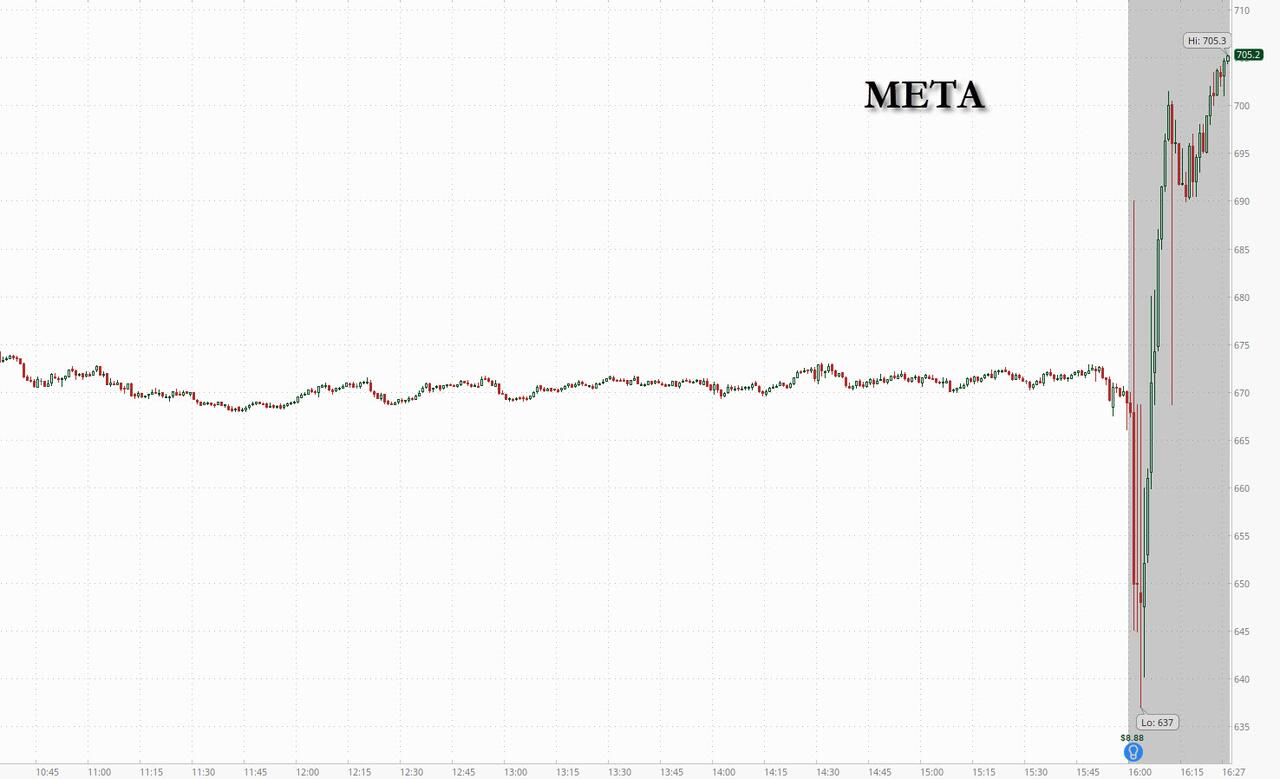 Indeed, META has dumped and pumped after hours: after initially dumping on the report of the blowout expense/capex surge, it was as if a relentless buyer stepped in and moved the stock from the session low of $637 to what has so far been an after hours high of $721.