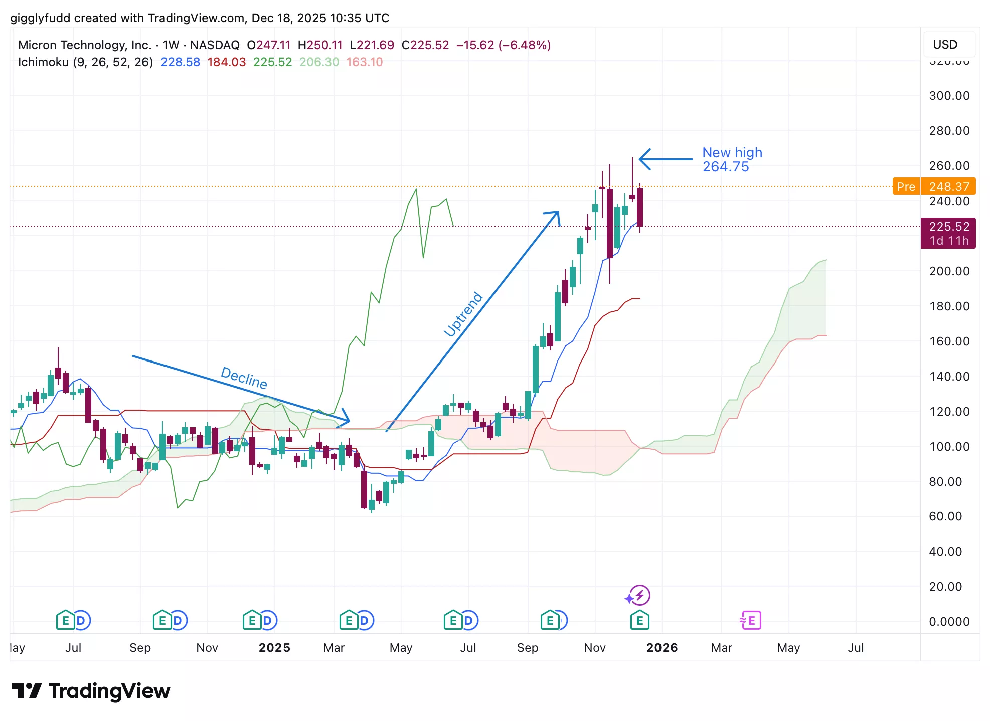 The stock went on to reach a new high of 264.75 in early December, confirming the strength of the longer term trend. The Ichimoku cloud remains bullish and thick, which signals sustained upward momentum and a healthy trend structure. The candles continue to stay above the cloud, with the cloud acting as a strong and reliable support zone, suggesting that the broader uptrend remains intact unless this support is decisively broken.