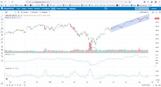 The graph below, courtesy of SimpleVisor, highlights the bullish trend channel (blue) from late May through mid-August.