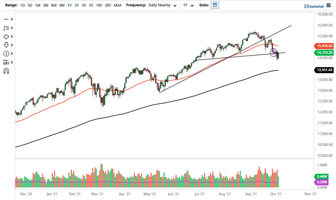 In order to break above the 15,000 level, we would have to see momentum pick up quite a bit in order to really get things going. Because of this, I anticipate that we will probably go back and forth between now and Friday, which is the non-farm payroll announcement. The 14,500 level looks to be offering support, so if we do pull back from here it is likely that we will go looking towards that level. If we break down below that level, then it is likely that we will go looking towards the 200-day EMA, which is sitting just below the 14,000 level.