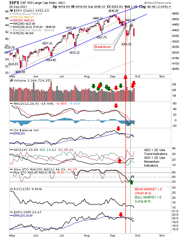 The Nasdaq finally gave in to the selling experienced by the S&P with breakthrough support defined by the July and August swing lows. It came with a 'sell' trigger in On-Balance-Volume and an acceleration in the relative loss to the Russell 2000. The next support level is the 200-day MA - a moving average that last saw a test in early 2020 when Covid first hit the headlines. It's hard to see buyers stepping in until we reach this moving average as there isn't a whole lot of alternative support to work with.