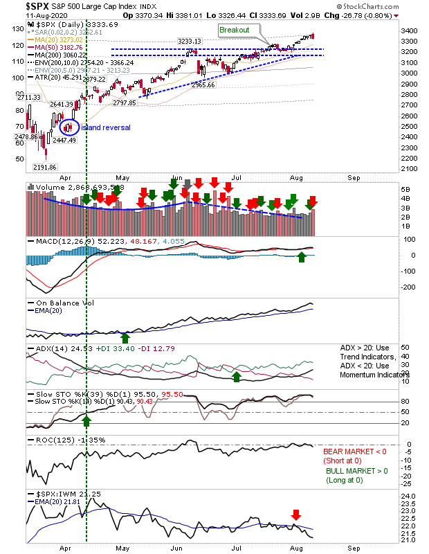 The Russell 2000 had edged a breakout on Friday, but finished today with a 'bearish cover' candlestick on confirmed distribution. With momentum overbought further downside should follow, which given the proximity of breakout support leaves the risk of a 'bull trap'. The main factor working in its favor is the relative performance advantage to its peers - which represents money flowing into the index and could yet maintain the breakout.
