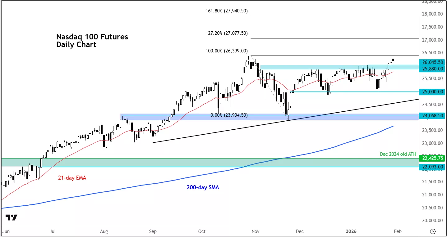 The technical picture on the Nasdaq 100 futures looks positive, given that it has just broken out of a multi-week consolidation to the upside this week, moving above former resistance in the 25,880 to 26,045 region. This area is highlighted on the chart and had capped rallies since the market peaked in October.
