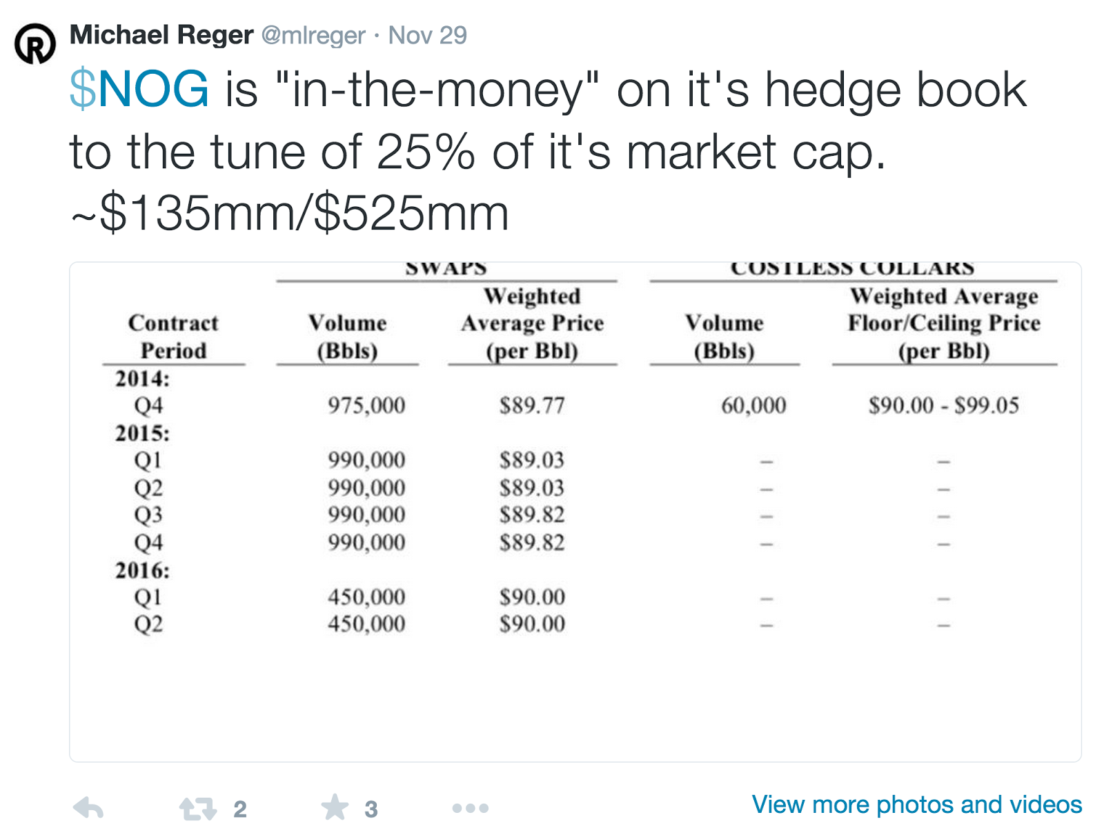 In another tweet he says that "$NOG has the most capex flexibility in the Williston. Oh, and we're hedged at ~$90."