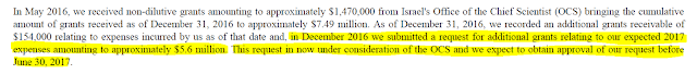 More importantly, I think the potential exists for additional grant funding to help support the planned U.S. Phase 3 study. Below is a snapshot from the Form 10K. Management just recently asked the OCS for $5.6 million in funds to support planned clinical activities in 2017. The OCS is expected to respond before June 30, 2017.