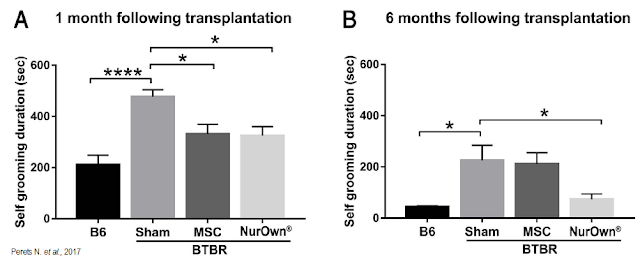 Results show that BTBR mice treated with MSCs and NurOwn demonstrate induced long-lasting effects of amelioration of autistic-like behaviors, including improved social interactions, reduced the repetitive behavior, and decreased cognitive rigidity compared to the sham injection. Imporantly, NurOwn demonstrated significant advantages over MSC transplantation in improving communication one and six months following treatment (see below) and NurOwn transplantation resulted in reduced stereotypic behavior that persisted for six months post treatment, compared to only one month observed in MSC-treated mice.