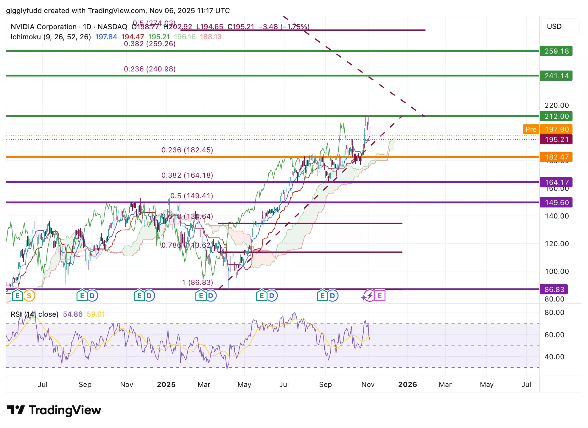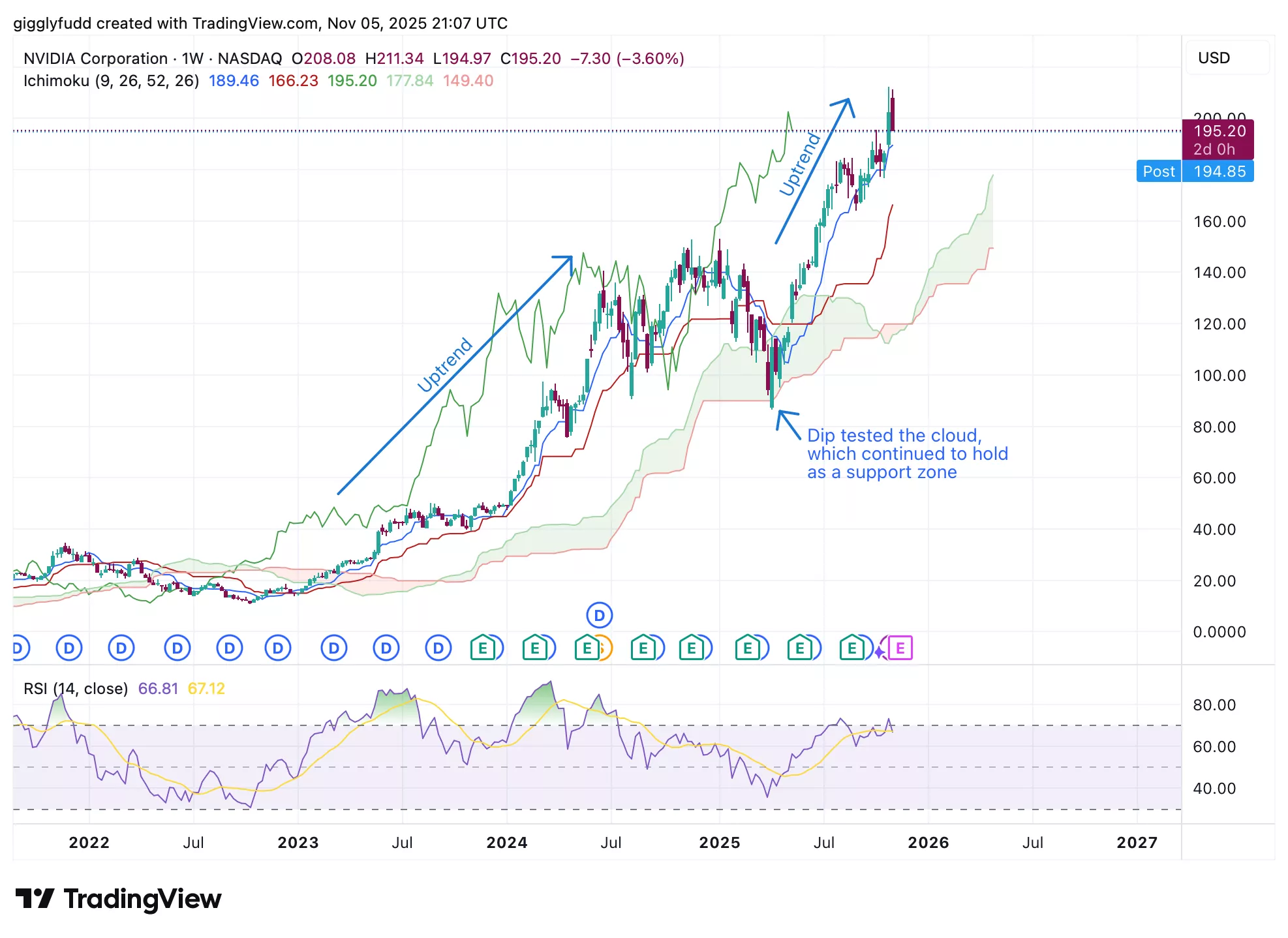 We can see on the weekly chart that Nvidia has maintained a strong long-term bullish trend, with price action consistently trending upward. The Ichimoku cloud remains predominantly green, acting as a key support zone. Earlier in 2025, Nvidia briefly dipped to test the cloud before resuming its uptrend, recently reaching a new high at the 212 level.