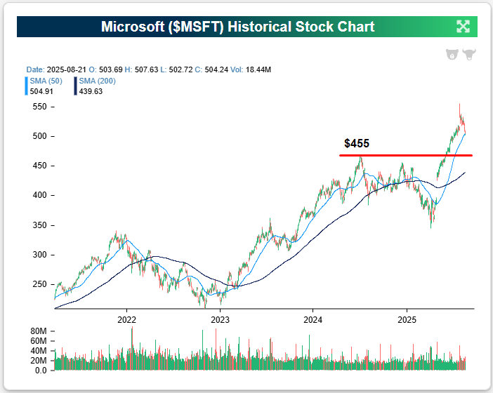 For Microsoft (MSFT), its first major support level to keep an eye on is $455; also represented by its 2024 highs made last July. MSFT came into today trading a few dollars above $500/share, so a drop to support at $455 would represent a decline of about 10%.