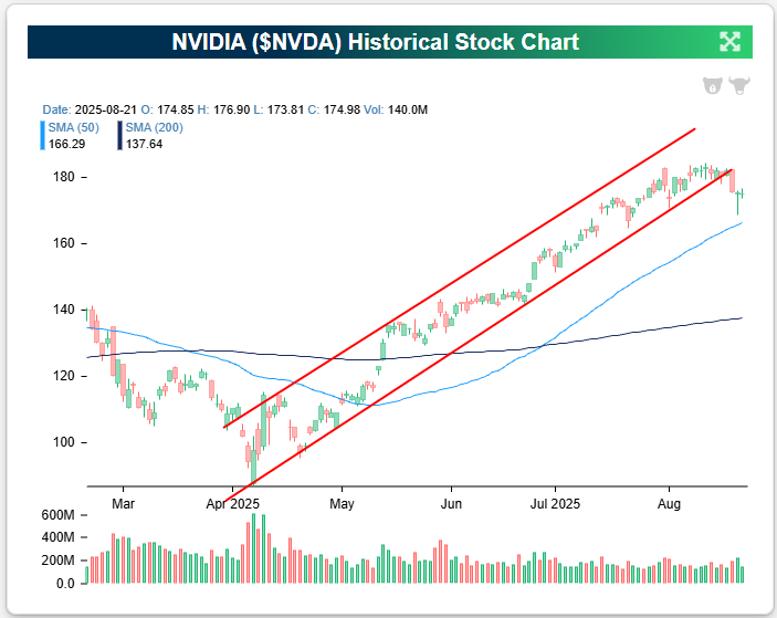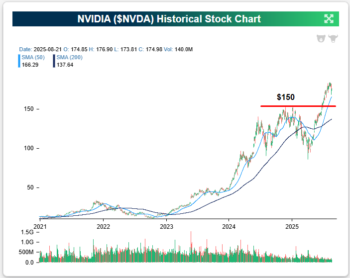 For NVIDIA (NVDA), its first big long-term support level is at $150, which represents its prior highs made at the end of 2024. That support is about $25 below where NVDA was trading coming into today.