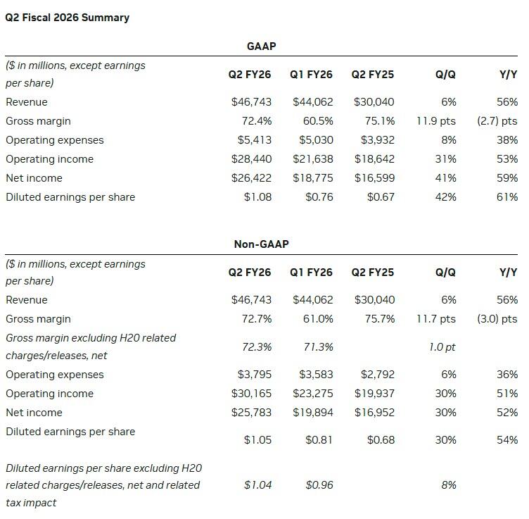 - Adjusted EPS $1.05, beating estimates of $1.00 (NVIDIA benefited from a $180 million release of previously reserved H20 inventory, from approximately $650 million in unrestricted H20 sales to a customer outside of China.)