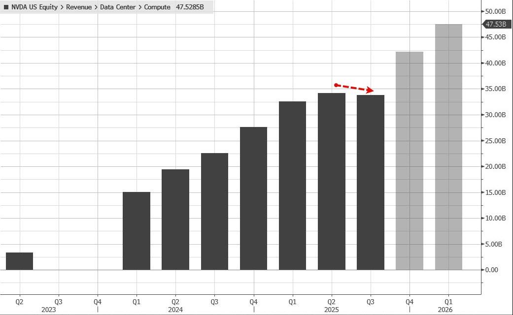 - Data center revenue $41.1 billion, +56% y/y, missing estimates of $41.29 billion; this was the second consecutive quarter in which data centers missed.