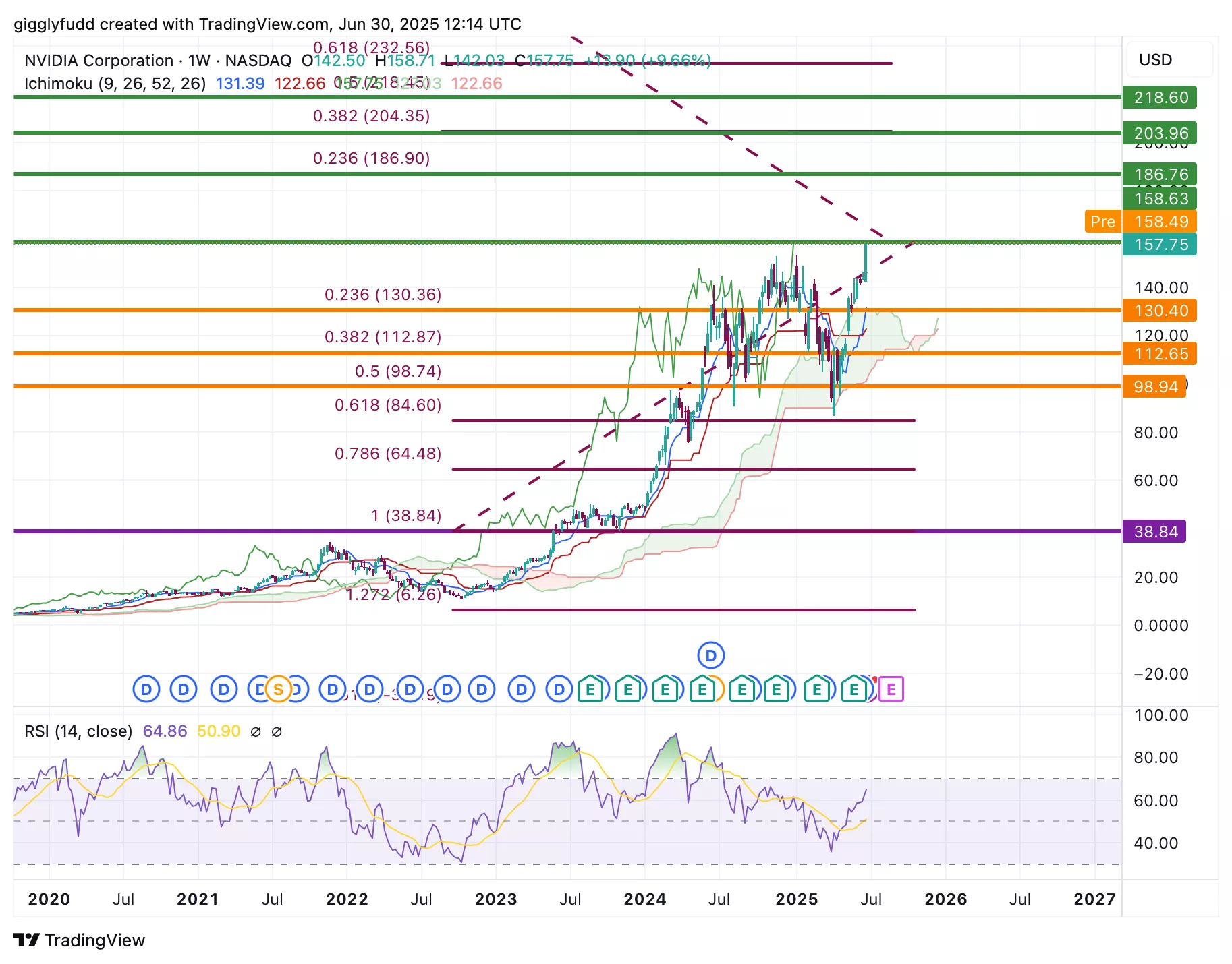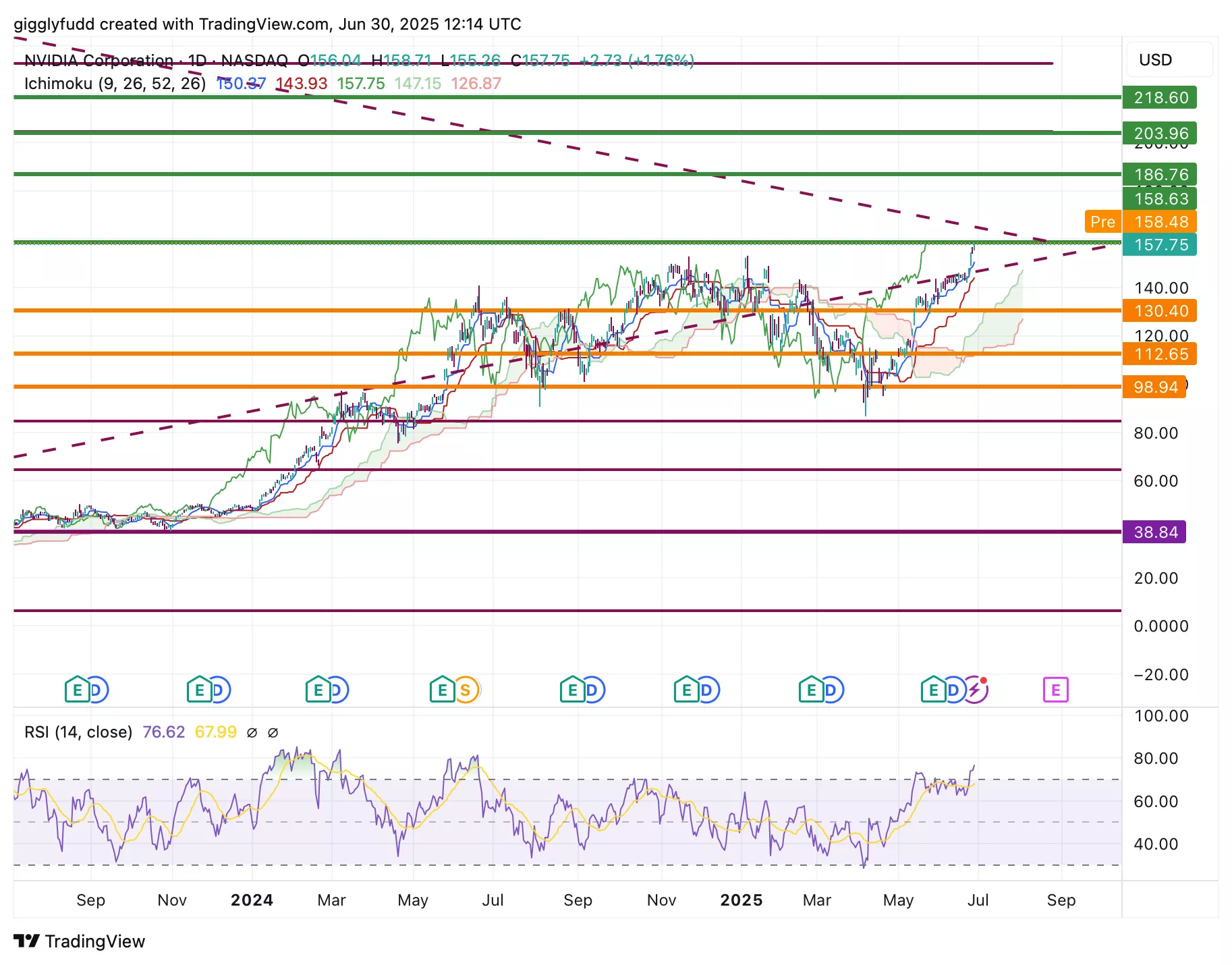 On the daily chart, just like the weekly, the signals are bullish: the future cloud is green, and candlesticks remain above the cloud. However, RSI is highly overbought at 76.62, indicating a possible short-term pullback or ‘correction’. This could present a buying opportunity if prices dip before resuming their longer-term uptrend.