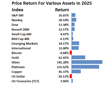 First, let me wish you a very Happy (and prosperous) New Year. As discussed in our previous commentary, 2025 was indeed another prosperous year for investors. The table below shows the price returns for various asset classes. While precious metals skew the chart somewhat, only Bitcoin and the US dollar noted declines for the year. (Not everyone can be a winner.)