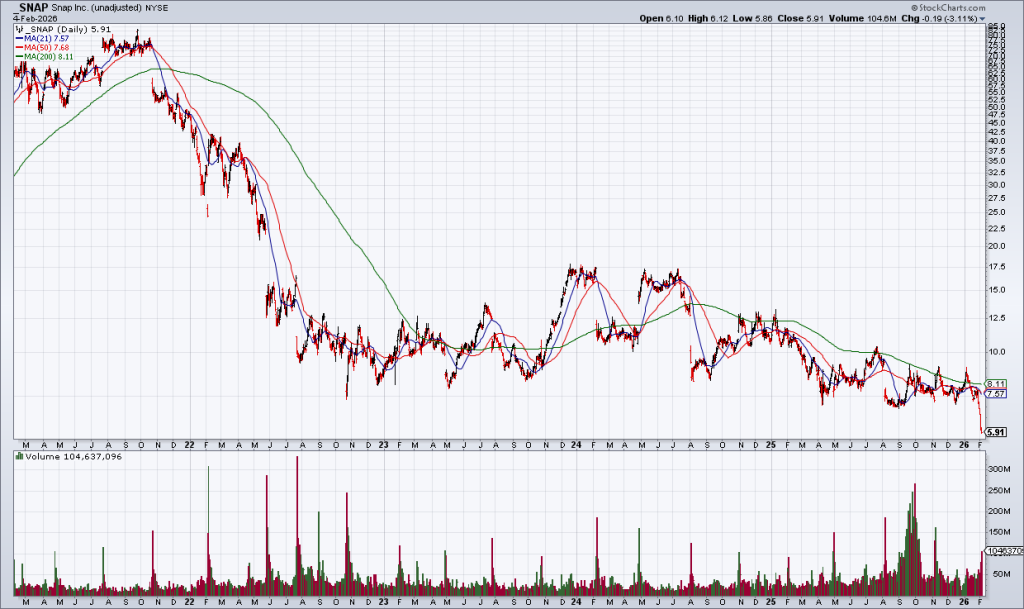 Snapchat (SNAP) has been one of the worst stocks in the market over the last five years. It just hasn’t seemed to be able to get its act together. While young people seem to love the app, SNAP has been unable to monetize its significant userbase (477 million Daily Average Users – Worldwide). But this quarter (4Q25) may represent a turning point.