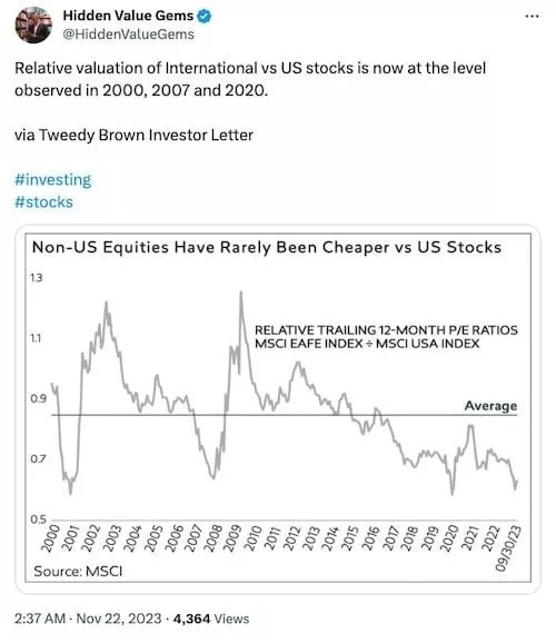 We knew non-US stocks were out of favor, but we had no idea it was this bad. Compared to their American counterparts, “international” stocks are now trading at some of the cheapest levels in well over two decades.