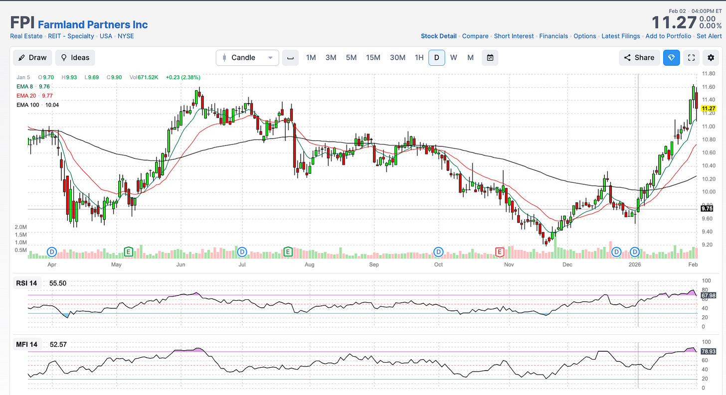 It’s been a month since we laid out a list of equities for 2026 with strong F scores, low Graham numbers, and the 20-day EMA. It’s been a busy month of analysis… so I will start circling back on those names and this trading strategy this month. Farm Partners (FPI) and Cal-Maine (CALM) have led the charge. If you’re in FPI, just note that the stock has moved into overbought levels…