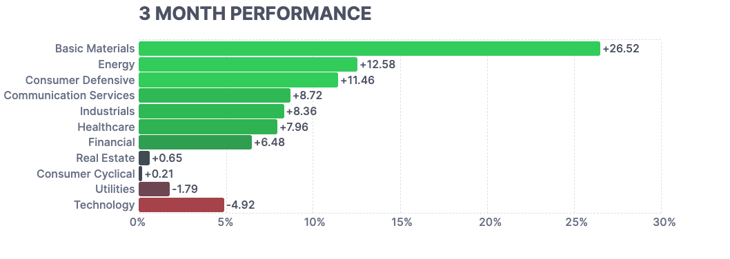 All the while, consumer defensive stocks - which typically start to do well as we move on the backside of these financial cycles - have been the third-best-performing sector over the last three months, outperforming technology and cyclicals, which are typically more aligned with the building of a liquidity cycle.