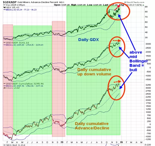 Above is the updated daily short term momentum chart for the up down volume and advance/decline for the GDX components; the monthly GDX chart remain bullish. The bottom window is the GDX cumulative A/D; next higher window is the GDX cumulative up down volume and top window is the GDX. Currently (red circle) GDX is holding near its highs and both indicators have flipped sideways and holding near their highs and holding above their mid Bollinger bands suggesting the GDX trend is still up.A close below their mid Bollinger band by both indicators would suggests that GDX is starting a consolidation. Seasonality turns from neutral to bullish starting December 20 (plus or minus one week).There is evidence the current rally may continue. Long GDX on 9/29/25 at 75.76.