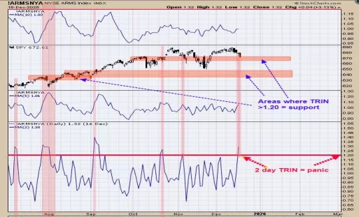 The tick and TRIN closes are showing panic readings over the last couple of days and panic only forms near lows. The bottom window is the two day average of the TRIN; readings above 1.20 are bullish. We noted the times when the 2 day TRIN reached 1.20 with shaded pink and where it corresponded with the SPY price. Yesterday the 2 day TRIN reached 1.30 and bullish. On the SPY window we noted the prices on the SPY when the TRIN reached 1.20 and higher with a vertical pink shaded area which is where panic has formed in the past. Past panic levels in the SPY are a support area and the SPY is testing the previous panic level. Should find support near current levels.
