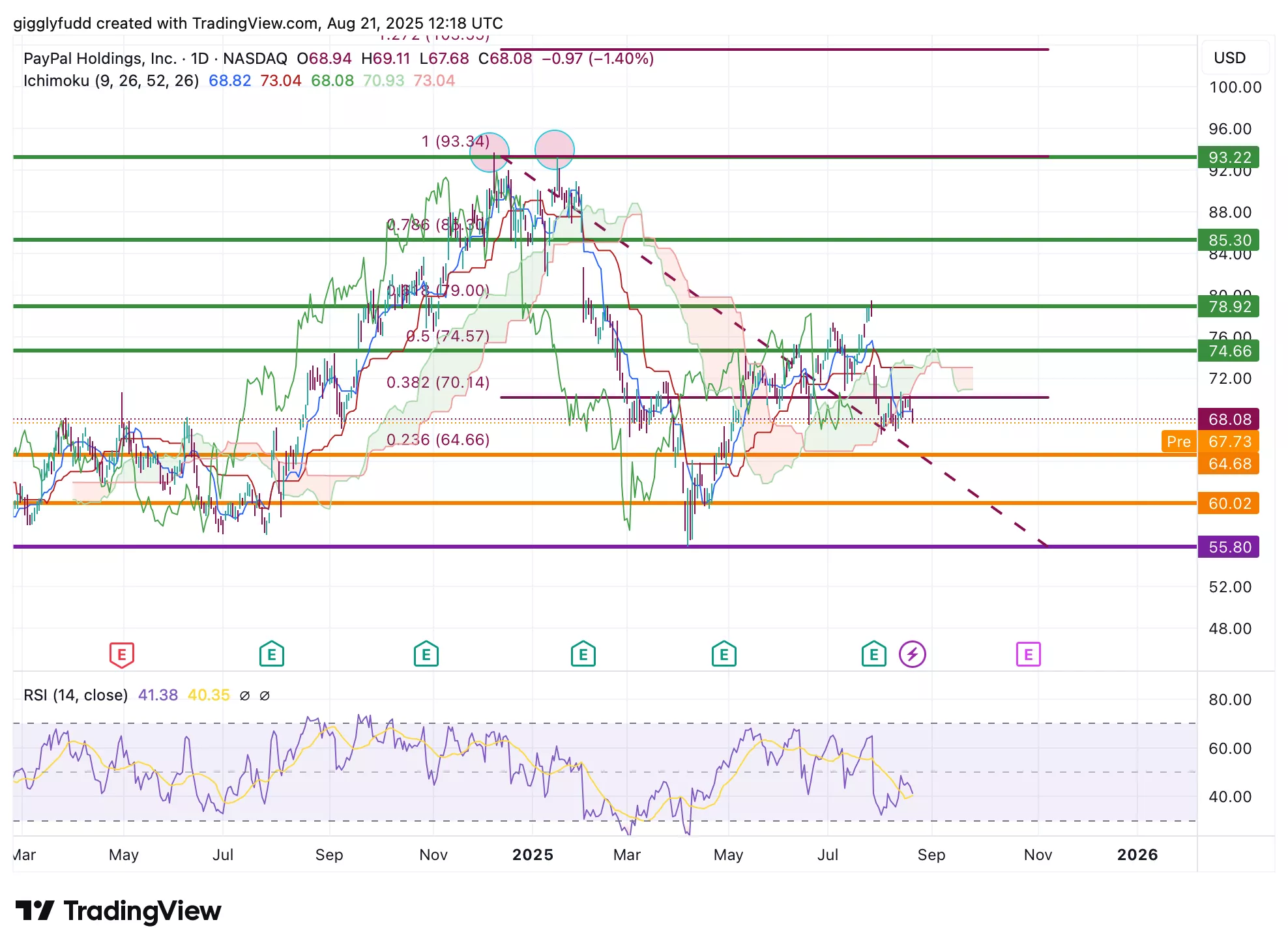 From a technical perspective, PYPL has been consolidating since its drop from all-time highs. The weekly Ichimoku cloud is bearish and flat, with candlesticks sitting below resistance, signaling market indecision. Until the stock breaks clearly above the cloud, upside potential looks limited in the near term.