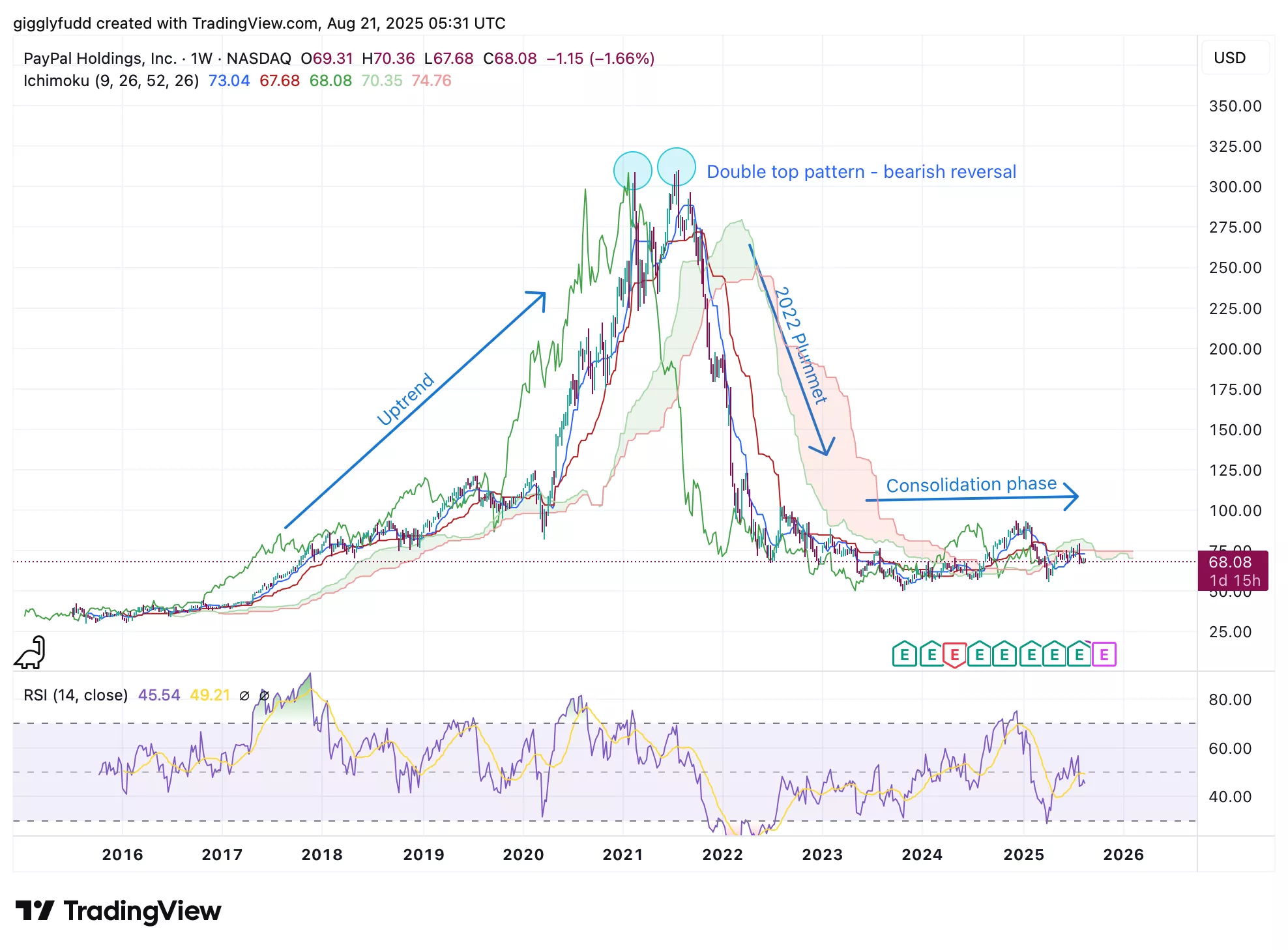 On the weekly chart, PYPL performed strongly until August 2021, when it peaked at 310. After forming a double top, which is a bearish reversal pattern, the stock fell sharply through 2022 into the 60 – 100 range, where it has been consolidating ever since. The Ichimoku cloud is bearish but flat, with candlesticks sitting below it, signaling weak downward momentum and the lower end of consolidation. The cloud also continues to act as a resistance zone, highlighting market indecision with no clear bullish or bearish trend.