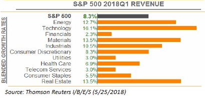Finally, earnings growth for companies is an important variable in the growth of a company's stock price. As the below table shows, and with 96% of S&P 500 firms reporting Q1 2018 earnings, earnings growth in the quarter is a strong 26.3%