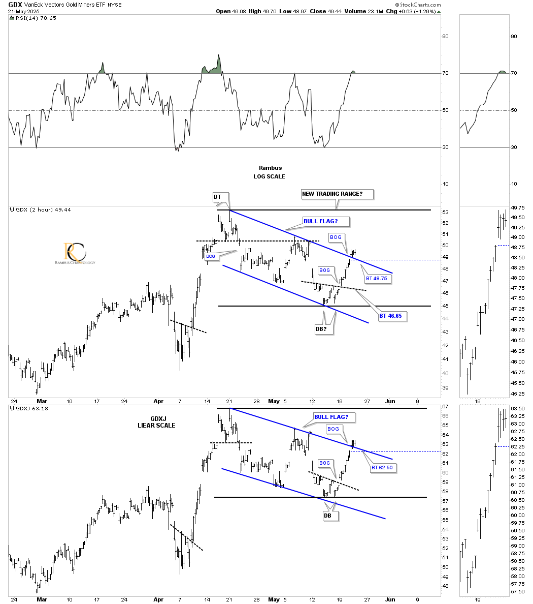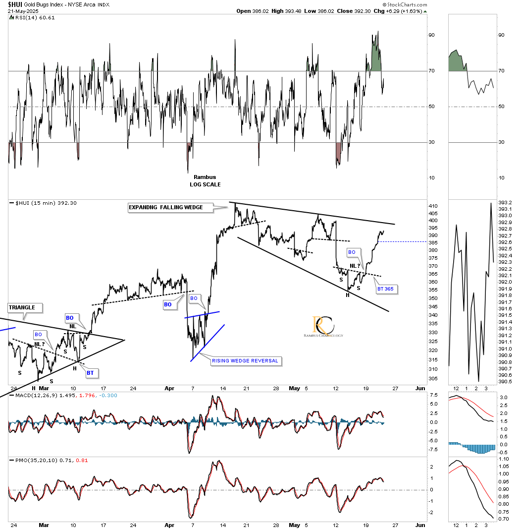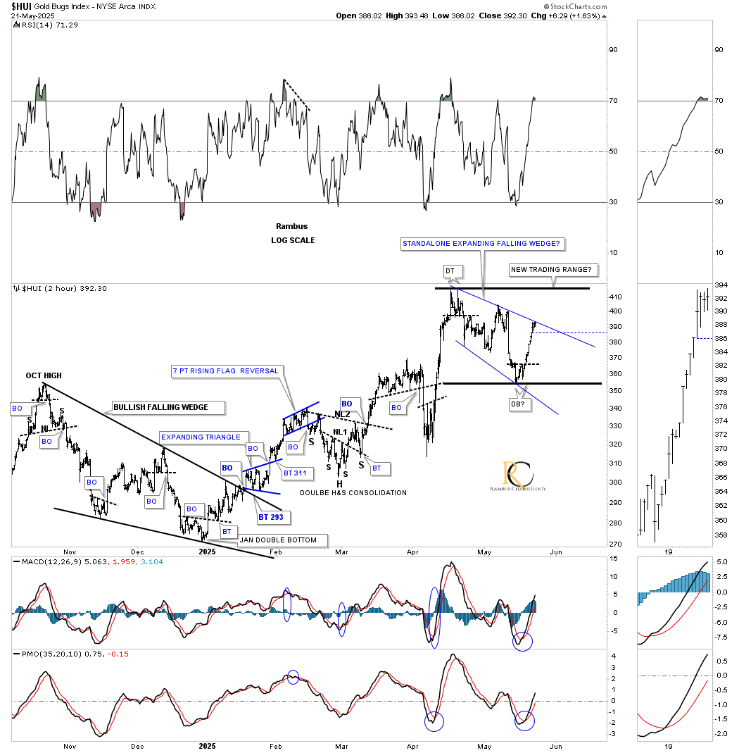 This long-term 2-hour chart shows the HUI closed just below the top rail of the blue expanding falling wedge today. Another question we still don’t have an answer for yet is whether the blue expanding falling wedge is going to be a standalone pattern that will lead to new highs for this move, or if the HUI is going to form a larger consolidation pattern.