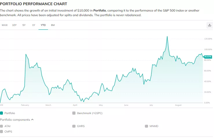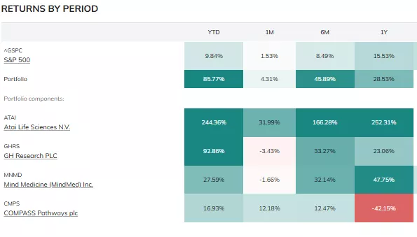 As mentioned in the introduction, atai Life Sciences is just one of 4 constituents in our Pure-Play Psychedelic-Compound Based Stocks Portfolio and below is a table of how they all performed in August, YTD, in the last 6 months and YTD provided by PortfoliosLab.com.
