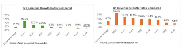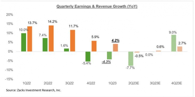 As you can see here, 2023 Q1 earnings are expected to be down -4.3% on +4.2% higher revenues. This would follow the -5.4% earnings decline in the preceding period (2022 Q4) on +5.9% higher revenues.
