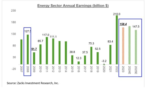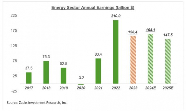 What this chart is telling us is that the Zacks Energy sector is currently expected to bring in $158.4 billion in earnings this year, down from $210 billion in 2022.