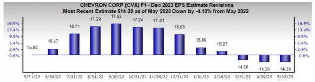 Chevron is currently expected to earn $14.39 per share in 2023. This is down from $14.56 per share at the end of March 2023 and $17.53 per share at the end of September 2022, as the chart below shows