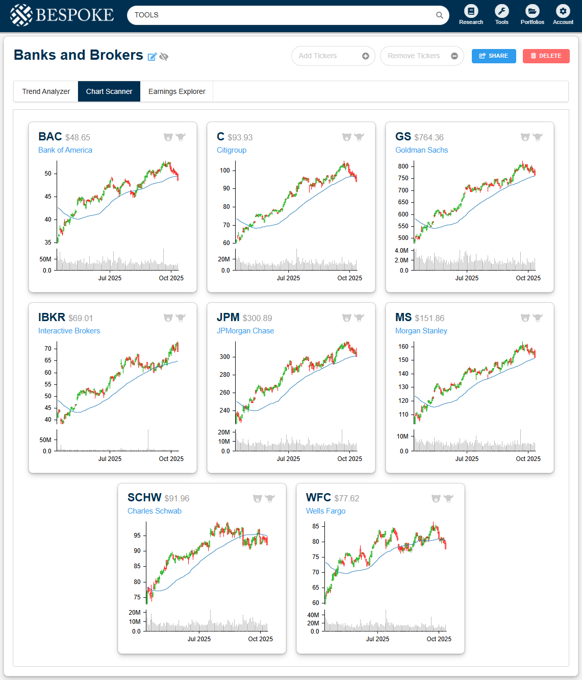 Eight big banks and brokers will report Q3 numbers in the next few days. We created a custom portfolio that includes each of these eight stocks so that we can take a closer look at them.