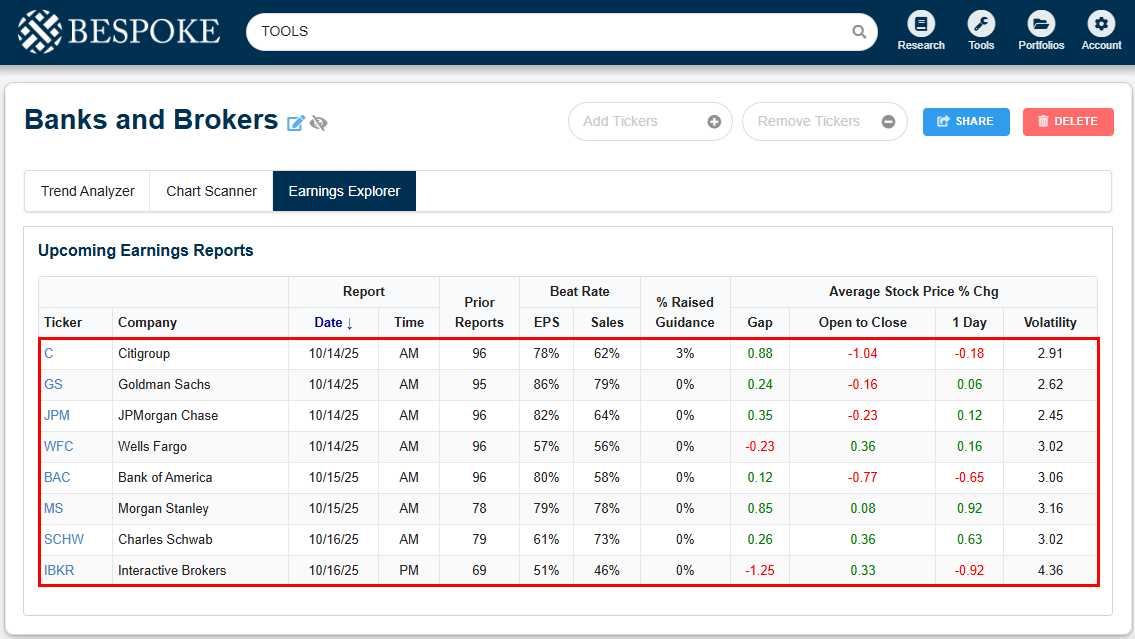 Bank of America (BAC) and Morgan Stanley (MS) will then report on Wednesday morning, while Charles Schwab (SCHW) and Interactive Brokers (IBKR) will report on Thursday.