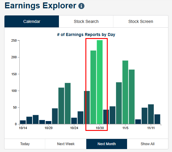 As the snapshot below from our useful Earnings Explorer tool shows, though, the peak of earnings season is still a couple of weeks away later this month. This quarter's biggest day for earnings will be Thursday, October 30th, when roughly 250 companies will report Q3 numbers.
