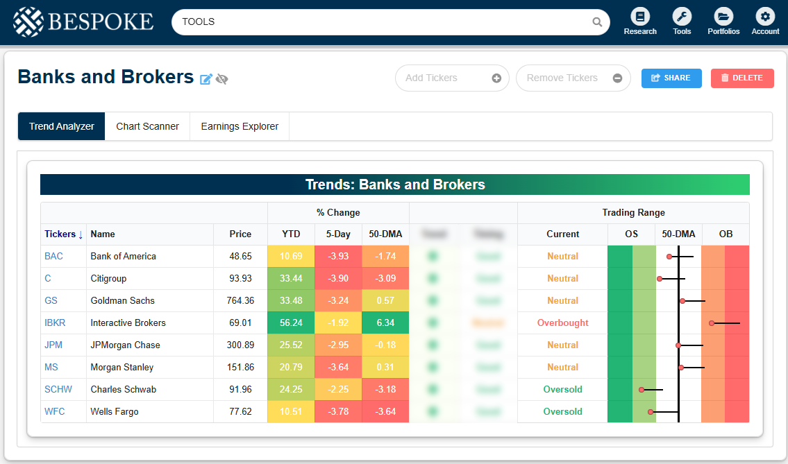 For our "Banks and Brokers" basket, you can see that all of these stocks have pulled back sharply within their ranges over the last week, following Friday's big pullback. Heading into this week, IBKR was the only name still in "overbought" territory, while SCHW and WFC had both moved into "oversold" territory.