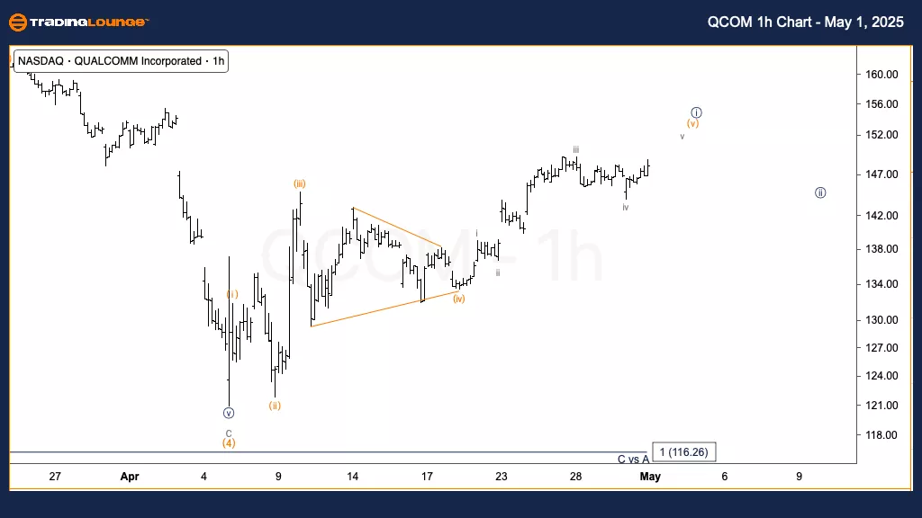 On the 1-hour chart, QCOM is in Wave (v) of {i}, with a final push higher expected before a potential top forms around the MediumLevel at $150. This zone will be key for observing resistance and potential trend changes.