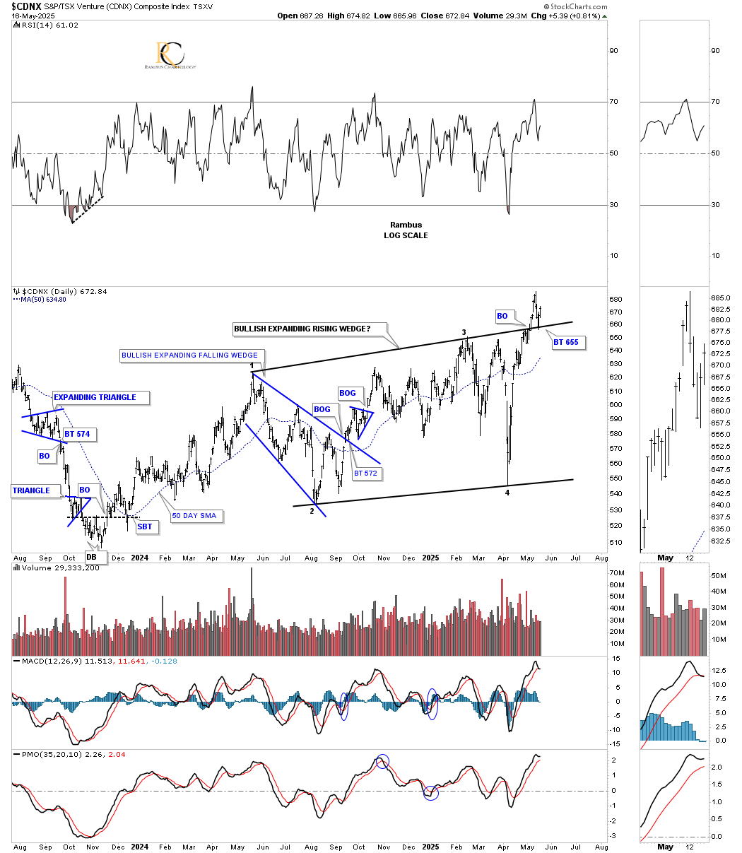 The very first chart in the Wednesday Report was this daily chart for the CDNX, which was testing the top rail of the bullish expanding rising wedge, the right shoulder of the much larger multi-year inverse H&S bottom. So far, we have a perfect backtest in place.