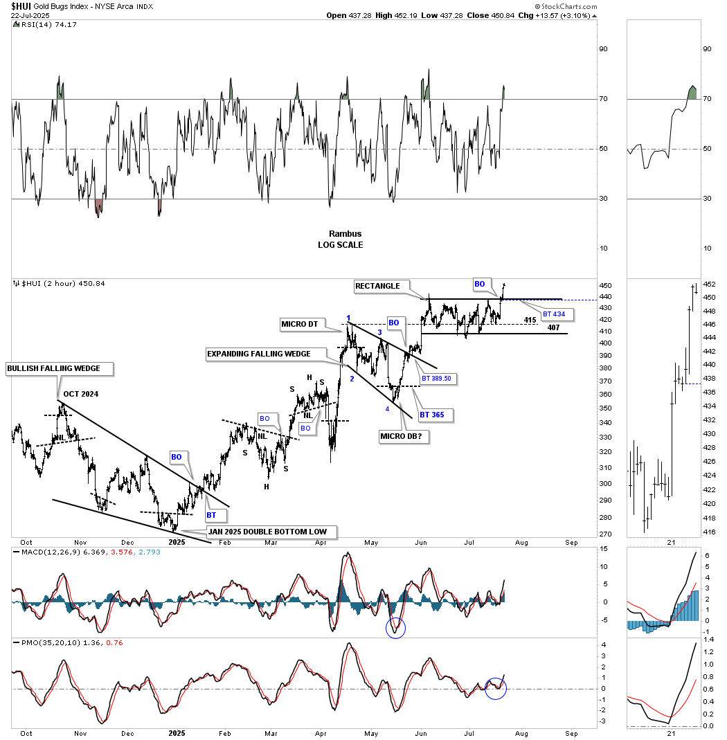 Just recently, we looked at the new sideways trading range/rectangle that had been forming just above the high of the bullish expanding falling wedge around the 415 area. Today, we got the breakout.