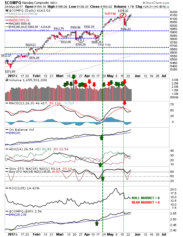 The Nasdaq isn't quite as close to the S&P in marking a new high, but today's action did negate yesterday's bearish 'black' candlestick. The 'bull trap' is just a few points away from being consigned to history - can tomorrow deliver?