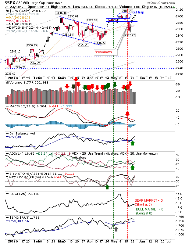 The S&P is only a short step away from confirming new highs, but today's action will have kept shorts wary with the risk of whipsaw high. A simple push above 2,406 could deliver an acceleration higher. The one disappointment is the light volume.
