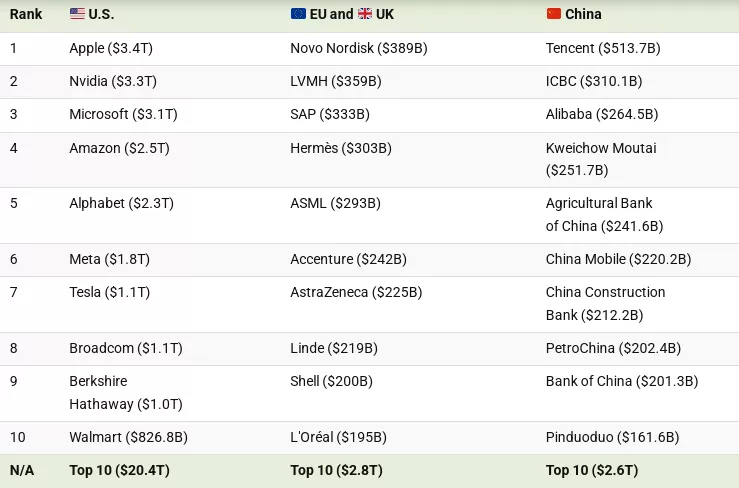This chart ranks the 10 largest companies in the U.S., EU (including the UK), and China by their market capitalizations.