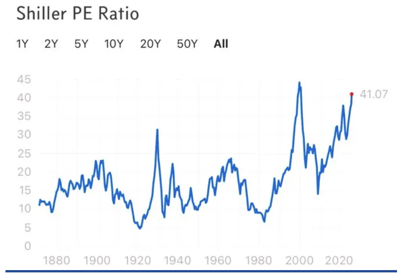 “Valuations (though not a reliable timing tool) are getting more extended — with the Shiller CAPE hitting 41 for the first time since 2000 (and if we adjust for lower tax rates today, the CAPE is near 47(!):”
